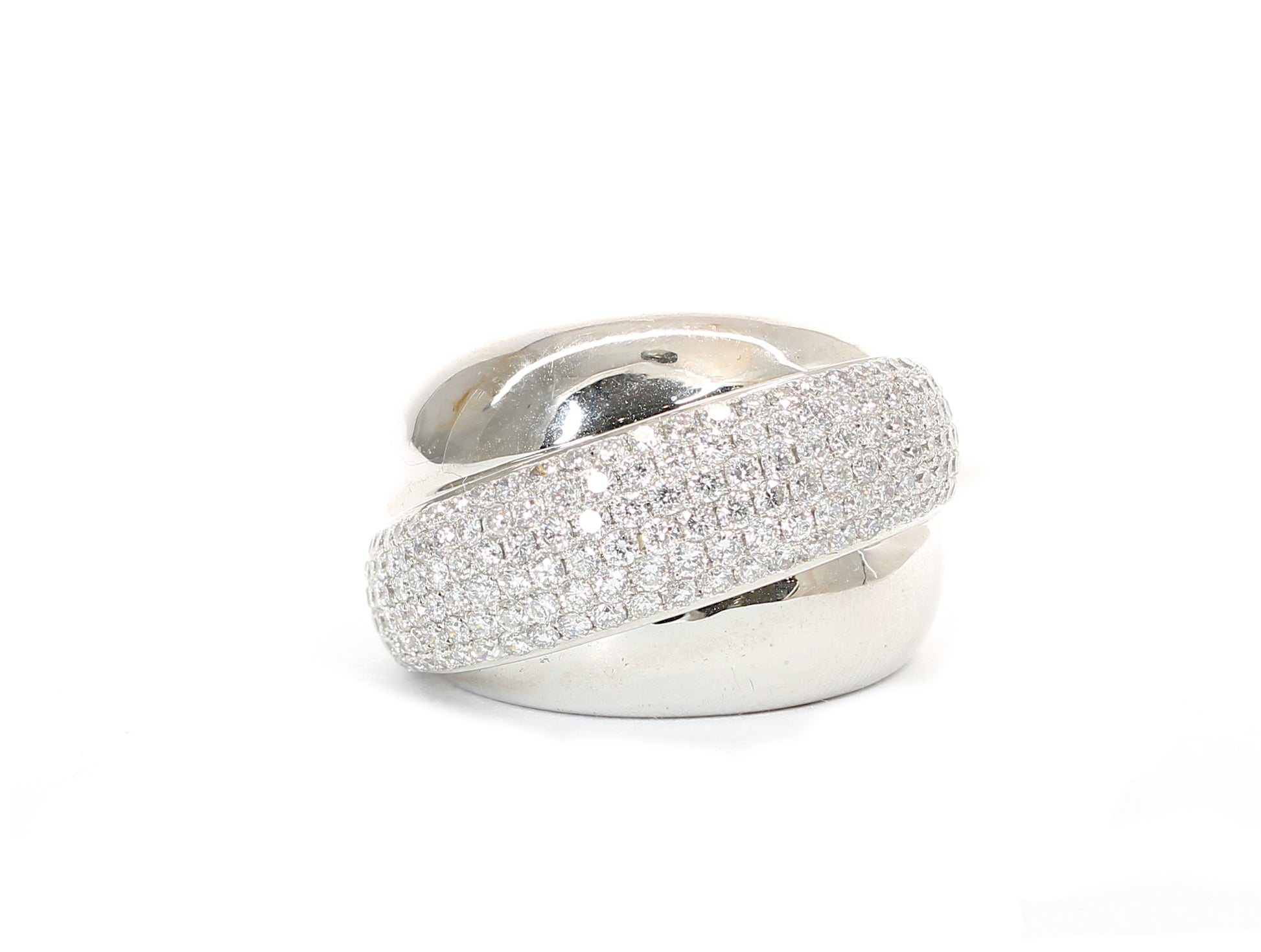 This 18k white gold diamond bypass dome ring weighs 13.1 grams and features 1.90 carats of diamonds. Its dome shape highlights the sparkle of the diamonds, making it a stylish and elegant piece. Perfect for anyone looking for a bold yet classic ring.