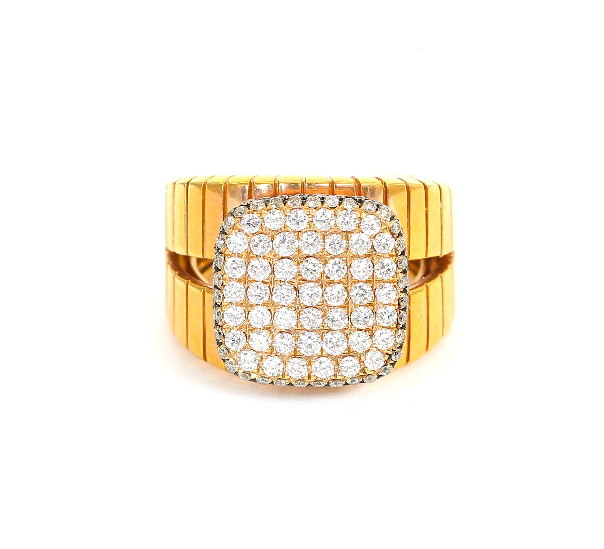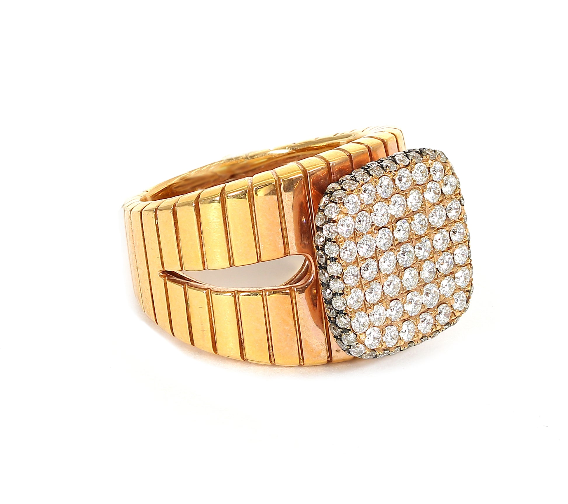 This 18k rose gold cocktail ring features a striking 1.30-carat total diamond weight set in a unique square cushion shape with an abstract design. Weighing 13.1 grams, the substantial rose gold band complements the intricate diamond arrangement, creating a sophisticated and bold statement piece ideal for discerning collectors seeking both artistry and luxury.