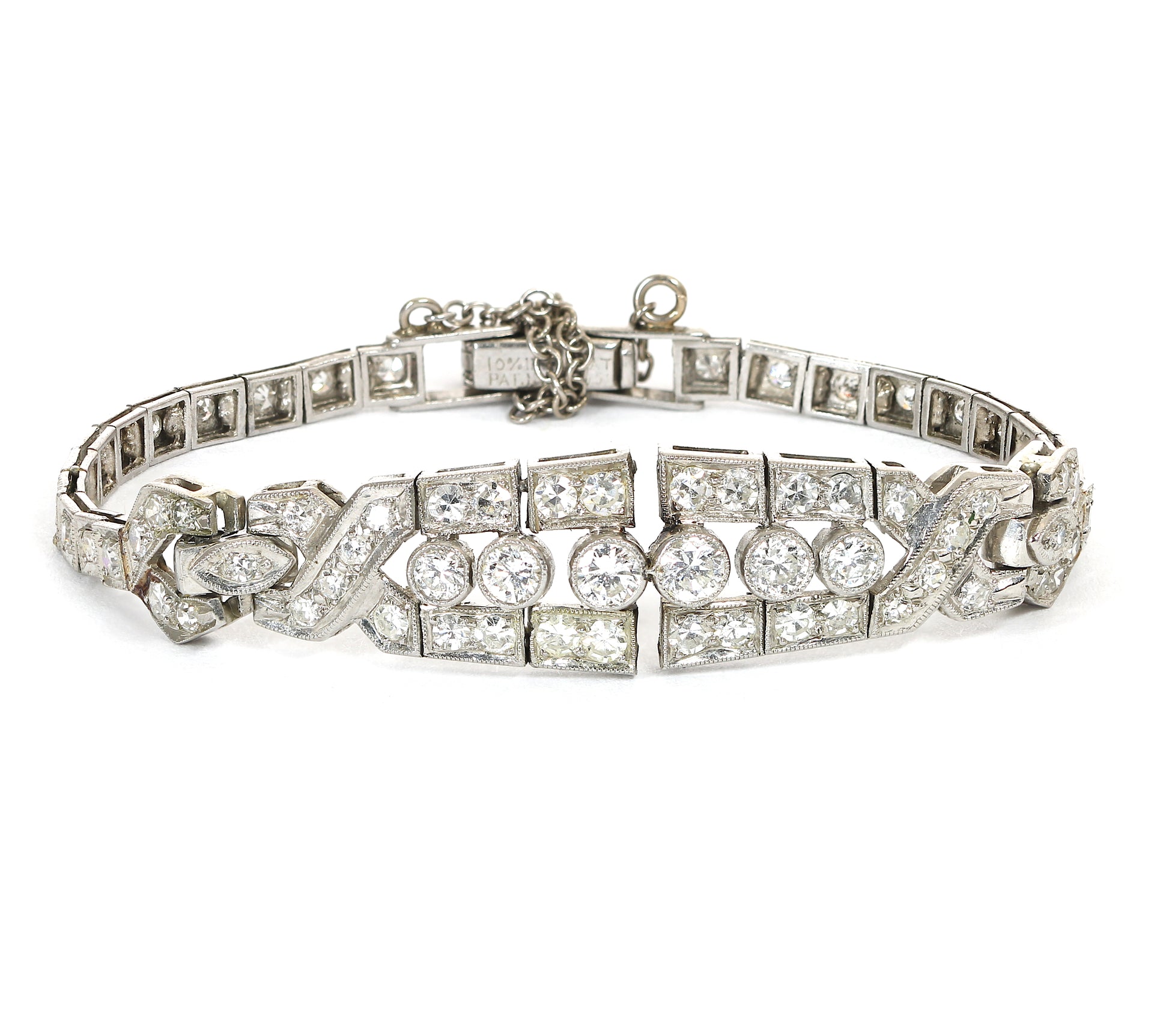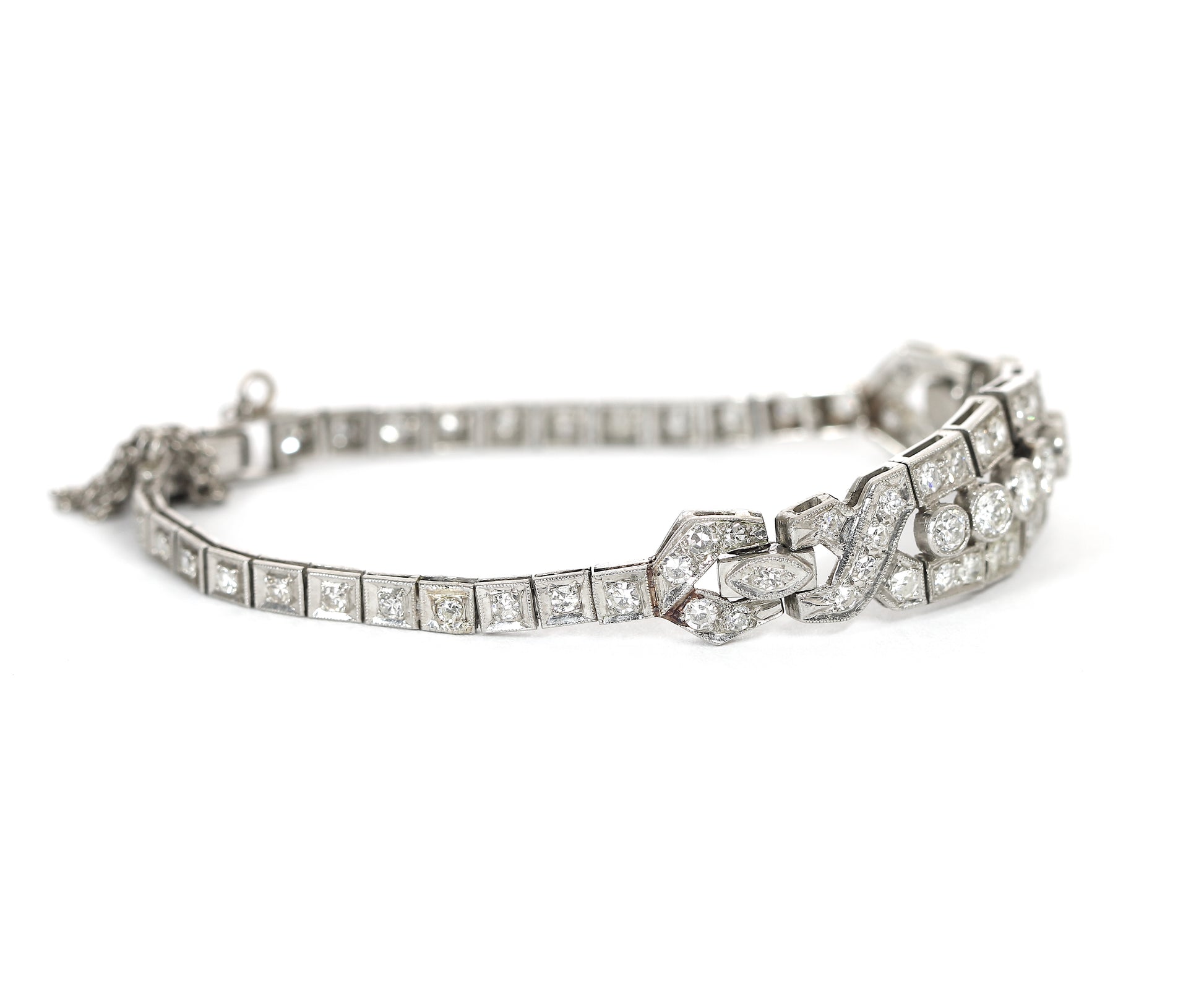This exquisite Art Deco bracelet showcases 1.75 carats of finely cut diamonds set in luxurious platinum. Its geometric design reflects the elegance and precision characteristic of the Art Deco era, making it a timeless piece that combines vintage charm with enduring quality. Perfect for collectors and connoisseurs seeking refined craftsmanship and classic sophistication.