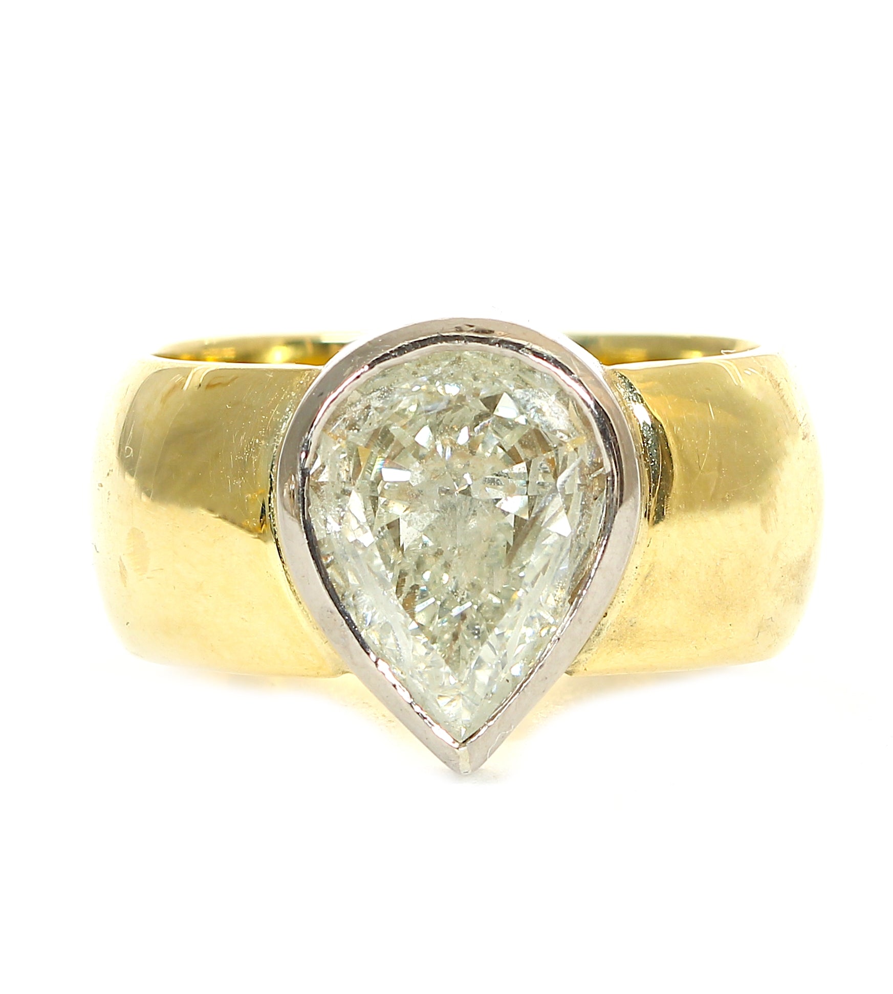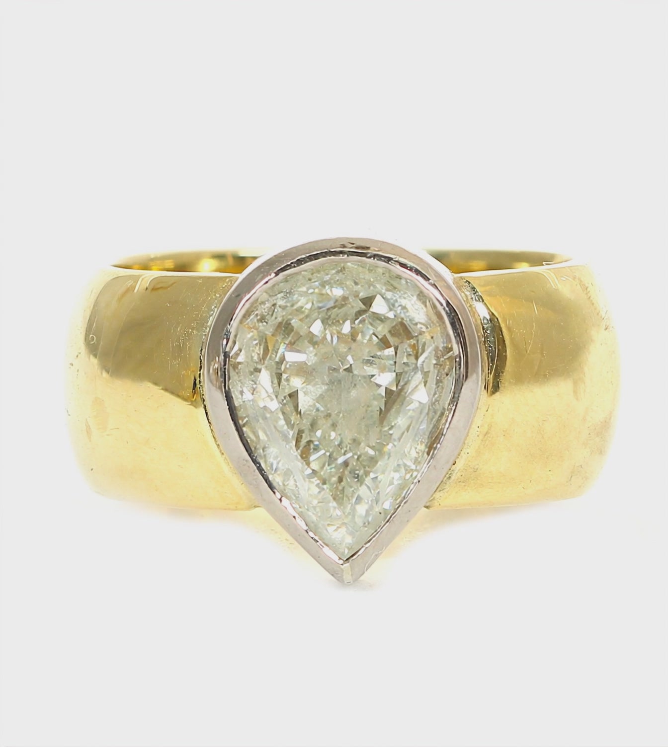 This diamond cocktail ring features a 3.00-carat pear-shaped diamond set in 18kt yellow gold. The design highlights the diamond’s elegant shape and brilliance, complemented by the warm tones of the gold setting. Crafted with precision, this ring offers a sophisticated and timeless accessory for special occasions.
