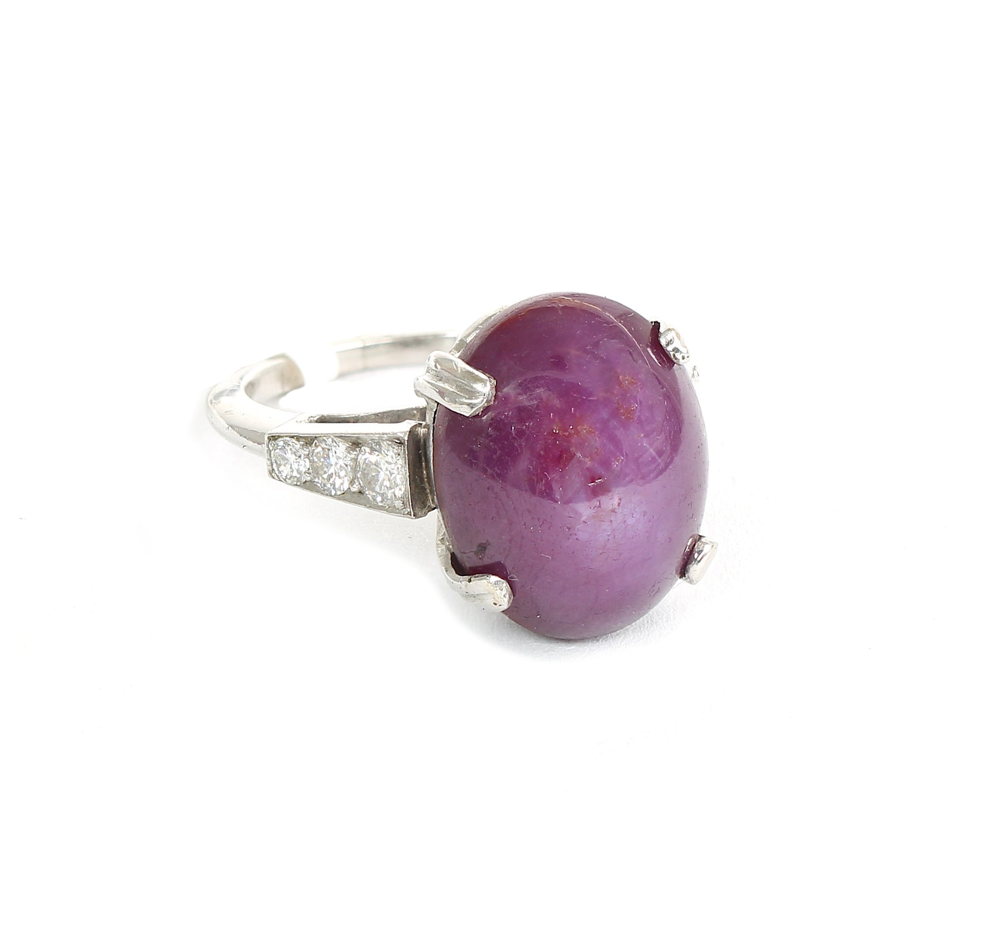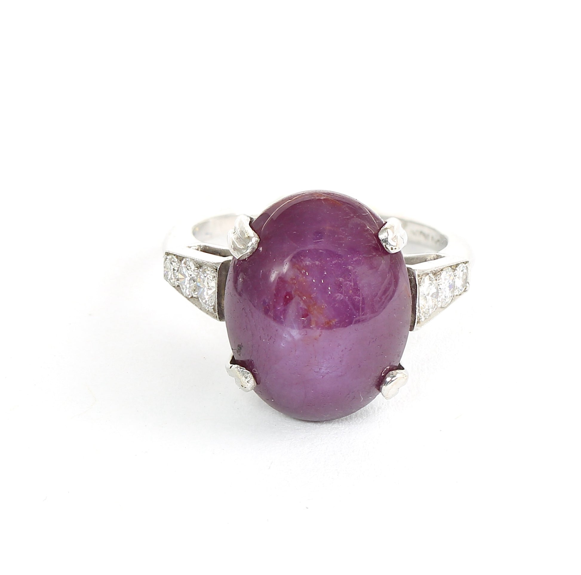 This vintage platinum ring features a stunning 9.34 ct cabochon ruby, complemented by 0.85 ct of natural diamonds. Weighing 8.67 grams, it combines classic elegance with lasting quality, perfect for adding a timeless touch to any collection.